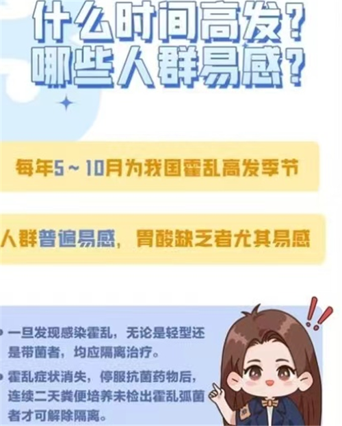 霍乱是由霍乱弧菌引起的急性肠道传染病,在我国属于甲类传染病,具有起病急、传播快、波及面广的特点,5至10月为多发季节,人群普遍易感。