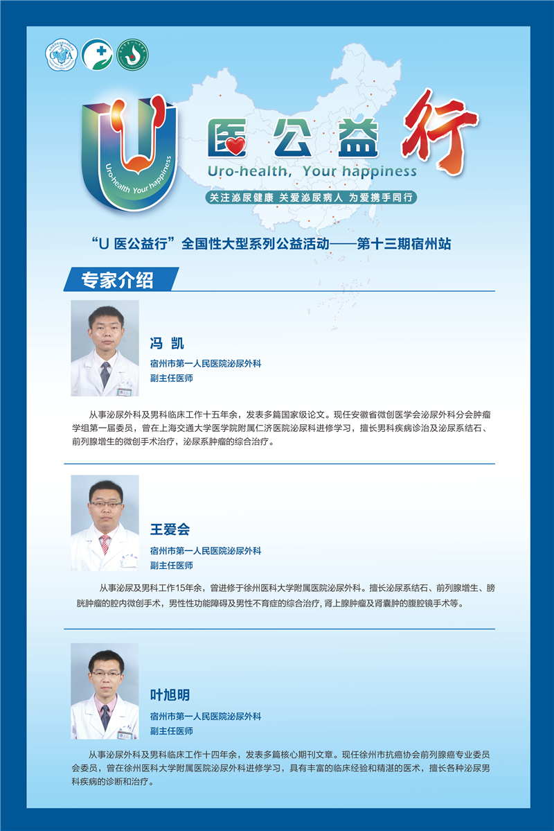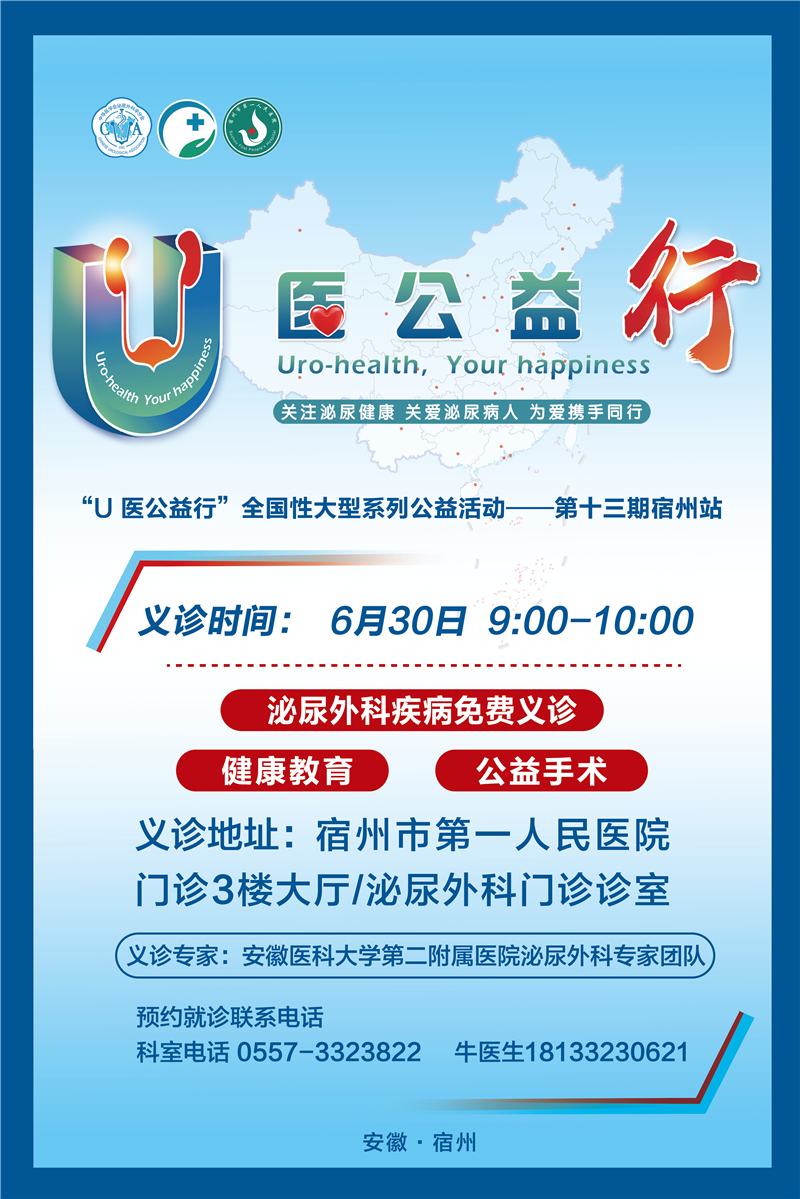 由中华医学会泌尿外科分会主办,安徽医科大学第二附属医院及宿州市第一人民医院承办的“U医公益行”泌尿义诊活动来宿州啦!届时省内知名泌尿外科专家将汇聚于此开展义诊、疾病筛查、专家免会诊费手术等活动,以最优质的医疗资源、顶尖的医疗技术服务于宿州百姓。