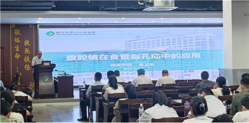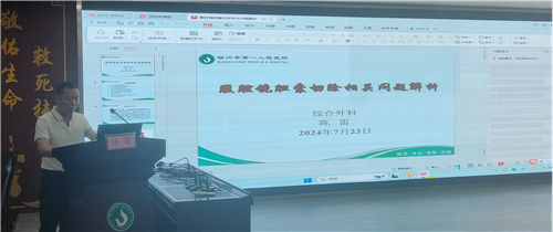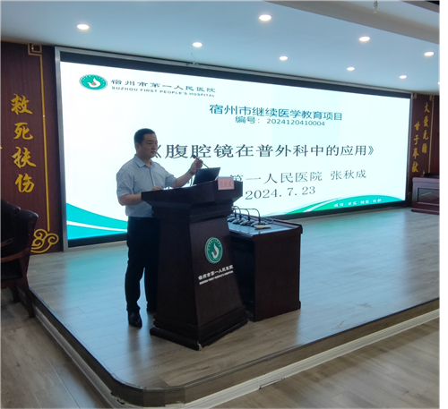 7 月 23 日下午,在我院科教科的指导与帮助下,综合外科顺利举办市级继教项目《腹腔镜在普外科中的应用》。其目的在于进一步提高普外科腹腔镜应用的专业知识与技能水平,以便更合理地运用腹腔镜为患者进行更高效的诊疗,减少患者的手术损伤,加快患者康复速度,提升医疗质量,保障医疗安全,推动腹腔镜微创事业不断发展,使更多人从中受益。继教活动由综合外科主任张秋成主持并致开班辞。