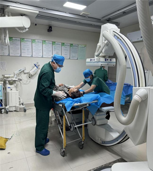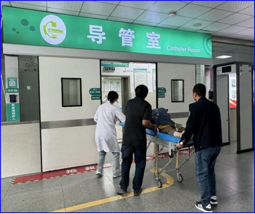 经过一番紧张而有序的转运,救护车终于在 9 点 56 分抵达了医院。患者被迅速转移到导管室内,这里仿佛是生命的战场。导管室内,医护人员早已严阵以待,他们各司其职,紧密协作,每一个动作都精准到位,每一个眼神都透露出坚定与专注。他们迅速为患者进行冠脉造影和支架植入等紧急救治措施,仿佛在与死神进行一场惊心动魄的较量。
