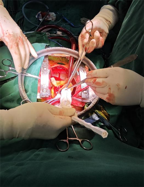 经全面细致的检查与诊断,该患者被确诊患有主动脉窦部及升主动脉瘤样扩张主闭(重度)并主狭(轻度)、左心增大并心功能减低以及心律不齐等复杂病症,病情危急,随时可能夺走生命。面对如此严峻的挑战,我院心脏外科联合中心王波院长团队毅然决定为患者施行Bentall手术,也就是“带瓣人工血管升主动脉替换术”。