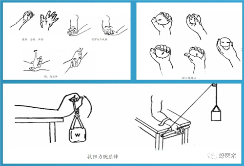 • 利用哑铃或橡皮筋进行手腕的屈伸、外展、内收等抗阻运动。