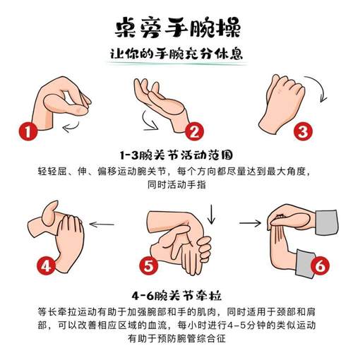 在日常工作和生活中,应保持手腕处于自然伸直的状态,避免过度弯曲或伸展。使用电脑时,键盘和鼠标的高度应适中,使手腕不过度下垂或上抬。