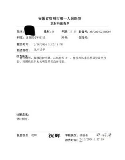 患者小尹,是一名 13 岁的女生,家住宿州市,目前还是一名学生。初诊日期为 2022 年 12 月 31 日。就诊及治疗过程· 初诊情况:2022 年 12 月 31 日,小尹因家人发现其脊柱侧弯,来到我院骨科门诊就诊,随后经推荐转诊至康复医学科进行矫正治疗。门诊医师在详细了解她的病情以及学业等诸多影响因素后,为她指导了一系列与脊柱侧弯相关的拉伸及锻炼动作,建议她进行家庭康复,并叮嘱要定期回院复查。