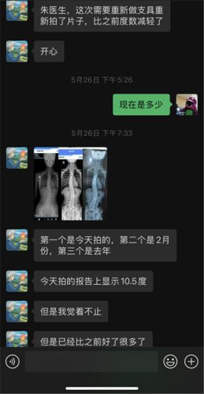 在后续与家属的微信随诊过程中,虽然小尹因为学业原因,没能按照疗程及时就诊,后续治疗也未能持续跟进,这确实有些遗憾,但家属反馈小尹的体态已经有了显著改善。后来复查全脊柱片时发现,其 cobb 角减小至 10.5°,这一结果充分彰显了浮针治疗以及早期治疗介入干预对于脊柱侧弯恢复的重要性。 治疗意义总结纠正青少年脊柱侧弯,其意义远不止于改善体态这么简单。通过矫正体态,能够帮助脊柱恢复正常的对称性,让孩子们在日常的活动中可以保持更好的平衡和姿势,避免因脊柱畸形压迫而导致心肺功能受损,还能减轻背部肌肉和关节所承受的压力,预防或者缓解疼痛症状。同时,体态的改善对于青少年的心理健康也有着积极影响,能够增强他们的自信心,让他们更加积极乐观地面对生活和学习。