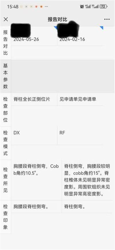 · 辅助检查:2023 年 2 月 16 日全脊柱片显示,脊柱侧弯情况在胸腰段较为明显,cobb 角约为 15°。