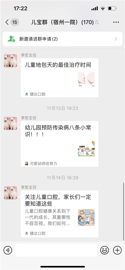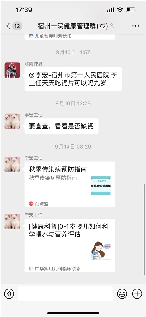 为了进一步方便患儿家长咨询就医,医院还贴心地建立了宿州一院儿科健康管理群。这个群不仅是医患之间便捷的沟通桥梁,用于疾病健康咨询交流、就诊预约、护理咨询等服务,更是一个充满关爱的大家庭,在这里,家长们可以畅所欲言,提出宝贵的意见和建议,同时也能及时获取各种科普知识宣教信息。通过这个群,儿科与患儿家长建立起了深厚的信任与和谐的医患关系,让家长们在育儿的道路上不再迷茫无助。