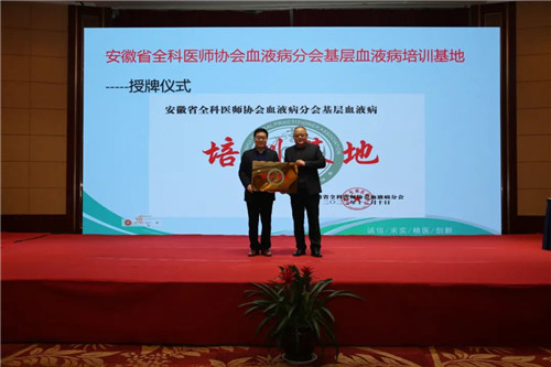开幕式上,宿州市第一人民医院副院长户学敏、宿州市医学会会长张立仿、安徽省医学会血液学分会主委夏瑞祥教授分别致辞。会前,安徽省全科医师协会秘书长陈文时教授与安徽医科大学第一附属医院曾庆曙教授为我院血液科授牌 “安徽省医师协会血液病分会基层血液病培训基地”。