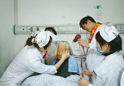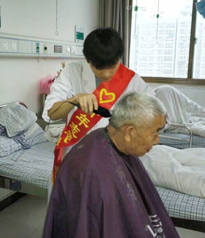 当天下午十一队共为17名病人洗头、9名病人理发、5位病人剃须。整整一个下午,十一队的队员们没有停下喝过一口水,没有坐下歇息一分钟,甚至没有来得及擦去脸上的汗水。从后面16楼,到前面7楼。在为胸心血管外科最后一位病人洗完头后才松了一口气。