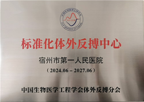 本次获得颁牌的标准化体外反搏中心单位全国共26家,其中宿州市第一人民医院榜上有名,成为安徽省首家获此认证的单位。