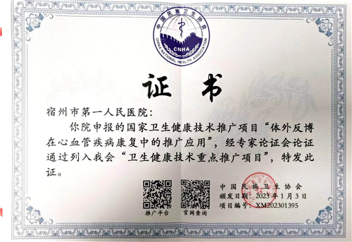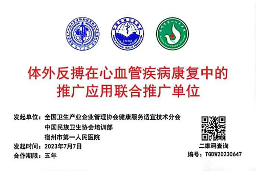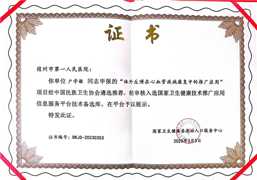 宿州市第一人民医院卫生健康技术推广项目《体外反搏在心血管疾病康复中的推广应用》在2022年被中国民族卫生协会列入“卫生健康技术重点推广项目”;经审核入选国家卫生健康委流动服务人口中心技术推广应用信息服务平台技术备选库,在平台予以展示;该项目列为全国卫生产业企业管理协会健康服务适宜技术分会与中国民族卫生协会联合推广单位;自2018年以来共开展体外反搏治疗近两万余次,共五千多名患者获益。同时,医院也将积极发挥国家“标准化体外反搏中心”的示范引领作用,加强与社区、基层医疗机构的合作,推动体外反搏技术在基层的普及和应用,为更多患者带来福音,推动体外反搏技术在全省乃至全国的普及和应用,为构建健康中国贡献自己的力量。