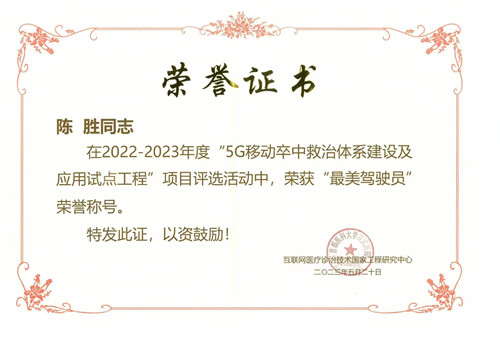 同时,在大会2022-2023年度“5G移动卒中救治体系建设及应用试点工程”项目评选活动中,我院喜获“最佳救治集体”荣誉称号!我院急救中心副主任王宏运和急救驾驶员陈胜,分别获“最美医生”和“最美驾驶员”荣誉称号!