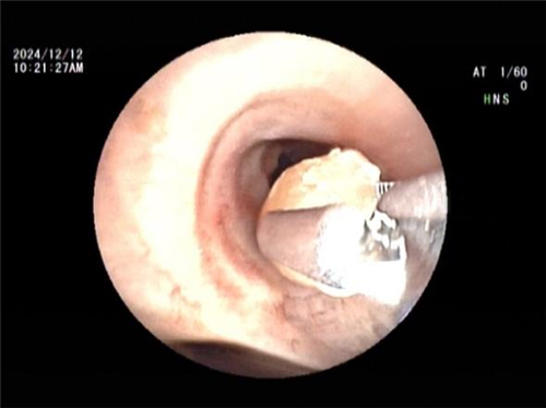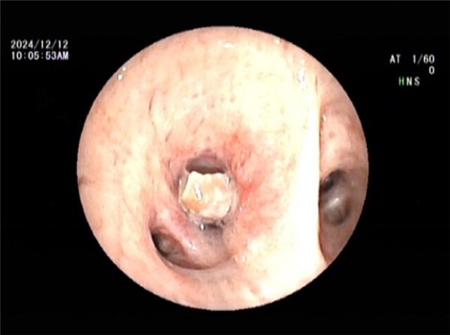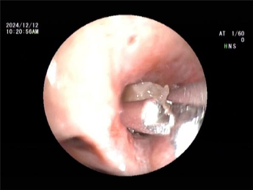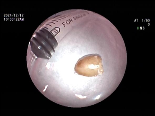 王海龙主任迅速组织团队对孟某展开全面综合评估,结合患者症状及各项检查结果,高度怀疑其患有吸入性气管异物并由此引发阻塞性肺炎。在与孟某及其家属进行充分且细致的沟通交流后,王海龙主任决定亲自为患者实施电子支气管镜检查。在支气管镜深入探查过程中,清晰可见患者右中叶支气管被一异物牢牢阻塞管腔。此异物表面光滑,质地极为脆弱,不仅易碎,还容易软化变形,这一系列棘手问题使得异物取出难度呈指数级增加。手术过程中,任何细微的失误都可能导致异物掉落至气管深部,从而引发更为严重且复杂的后果。但王海龙主任凭借其精湛高超的医术与沉稳冷静的临场应变能力,运用异物钳小心翼翼地进行操作,经过多次精准尝试,最终成功取出一枚长径约 1cm 的异物。术后,孟某的呼吸即刻恢复通畅,经过 5 天系统且精心的治疗,咳嗽、咳痰症状显著缓解,胸闷、气促等不适症状全然消失,肺部感染病灶也得到明显吸收。经确认,此次引发孟某一系列病痛的 “罪魁祸首” 竟是一粒花生米。