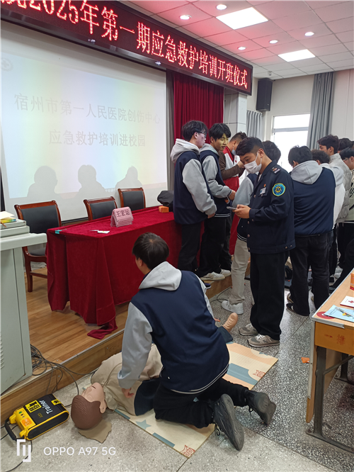 在第 62 个学雷锋纪念日来临之际,3 月 5 日,宿州市第一人民医院急救中心党支部携手埇桥区红十字会,走进宿州市技师学院,成功举办了一场 “急救技能进校园” 公益培训活动。此次活动采用 “理论授课 + 实操训练 + 认证考核” 的全链条培训模式,为 200 余名师生带来了专业、系统的急救技能培训,同时完成了红十字救护员认证工作。