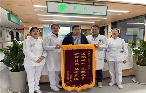 入院后,眼科医护团队迅速行动,为殷某制定个性化治疗方案。考虑到患者心思敏感,眼科护士长尹翠玲带领护士们主动与殷某及其家属耐心沟通,用温暖的话语和专业的态度,逐渐打开了患者的心结。床位医生及责任护士精心安排各项检查,在治疗过程中采用人性化护理服务,不仅按时为患者应用眼药水、确保口服药看服到口,还时刻关注患者的防摔倒安全、眼部清洁以及饮食调理等细节。在医护团队的共同努力下,殷某积极配合治疗,病情逐渐好转。康复之际,殷某将一面绣有 “医德暖心 尽职尽责,护理体贴仁爱天使”的锦旗郑重交到医护人员手中,以此表达他深深的感激之情。