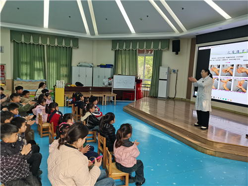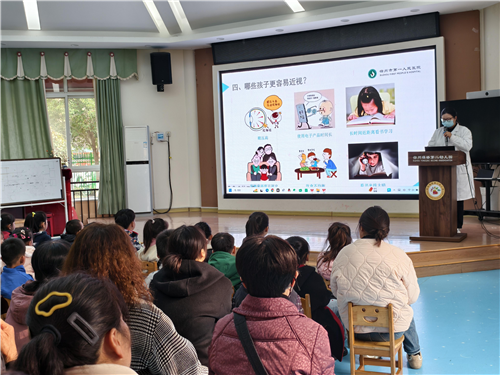 随后,眼科鲍悦医师带来了 “珍爱眼睛,保护视力” 的主题分享。鲍医师采用 PPT 演示与动作示范相结合的生动方式,深入浅出地为大家讲解了儿童保护视力、预防近视的方法及注意事项,让孩子们直观了解到保护眼睛的要点。
