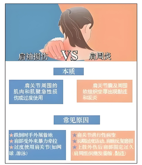 其中肩周炎和肩袖损伤是两种常见的肩部疾病,它们的区别主要体现在以下几个方面: