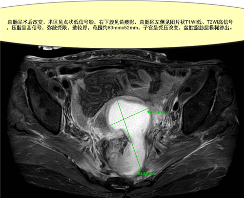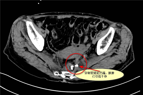 案例2.卞**,87岁女性,于上级医院行直肠癌根治术,因盆腔脓肿,反复腹痛伴发热10天收住胃肠外科,联系我科给予经直肠腔内超声引导下盆腔脓肿穿刺置管引流,引流当天体温即恢复正常。