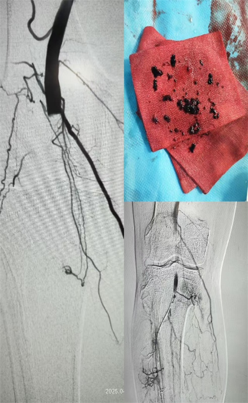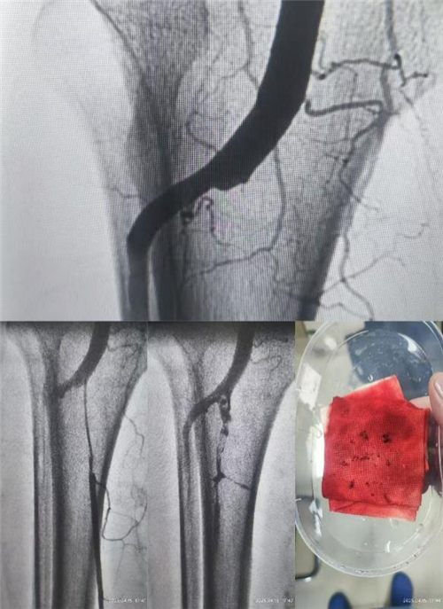 37小时后,医护团队再次出击,在局麻DSA下为患者进行双下肢动脉造影+导管内吸栓+下肢动脉导管溶栓术,又抽出约25克陈旧性血栓。术后,护理团队迅速进入“精细化”模式,用压迫器为患者加压止血,每30分钟就仔细巡视检查穿刺点,确保没有渗血、血肿;每小时触摸足背动脉搏动,监测皮肤温度与颜色变化,不放过任何一个细微异常。
