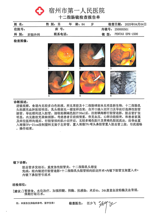 近日,宿州市第一人民医院上演了一场惊心动魄的生命救援。消化内科团队凭借精湛的ERCP(经内镜逆行胰胆管造影)技术,成功将一名合并多重猝死高危因素的高龄重症急性化脓性胆管炎患者从死亡边缘拉回,再次彰显了医院在危急重症救治领域的硬核实力。病情危急,生死攸关患者84岁因“右上腹疼痛伴皮肤黄染、纳差 5 天”紧急入院至我院肝胆外科。尽管医护人员立即开展抗感染、保肝等对症治疗,但患者病情并未得到缓解,反而持续恶化。4月4日清晨,患者血压骤降至75/45mmHg,情况急转直下。经全面诊断,患者不仅患有重症急性化脓性胆管炎(AOSC),还同时伴有急性左心衰竭、心房颤动、频发室性早搏、肺源性心脏病、休克血压、血液高凝状态、低蛋白血症以及低钾血症等多重致命风险。