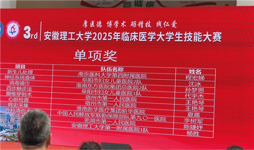 5月17日,安徽理工大学临床医学第三届大学生技能大赛在阜阳市妇女儿童医院(安徽理工大学附属阜阳医院)激烈开赛。在这场汇聚众多医学生精英的较量中,我院首次参赛便上演“黑马逆袭”,以绝对实力斩获团体赛一等奖,更在 10个单项奖中一举拿下腰椎穿刺术和心脏检查两个单项一等奖,成为全场焦点,书写了属于我院的荣耀篇章!