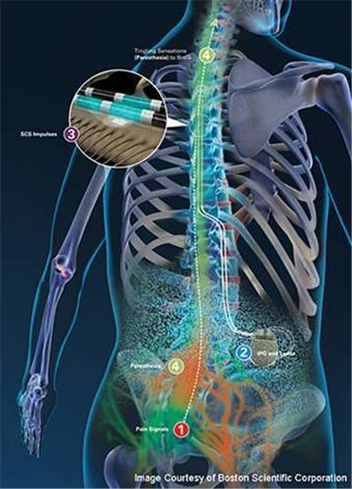 答:脊髓神经电刺激疗法是一种安全、有效的治疗多种慢性顽固性疼痛的方法。通过将植入脊髓硬膜外腔的电极导线,把神经刺激器产生的电流传导至脊髓,对脊神经进行低压电刺激,阻断疼痛感向大脑中枢的传递,从而达到缓解疼痛的效果。