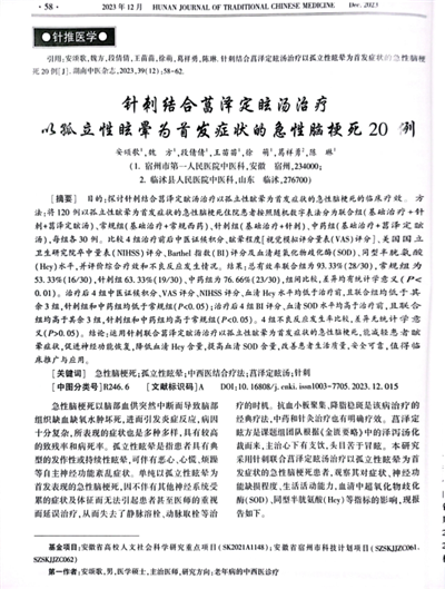 陈琳主任团队深耕“以眩晕为首发症状的急性脑梗死”诊疗,不仅积累了丰富的临床经验,更深入研究发病规律,优化治疗方案。团队撰写的论文《针刺结合菖泽定眩汤治疗以孤立性眩晕为首发症状的急性脑梗死2 例》发表于国家级科技期刊《湖南中医药》,还以此为基础成功申报安徽省重点实验室课题,用科研力量支撑临床疗效。