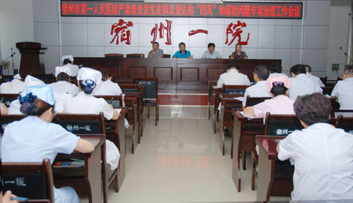 孟院长最后指出,全体党员干部职工,要切实增强工作责任心,通过此次严肃查处发生在群众身边的“四风”和腐败问题专项治理工作,发现一条线索,化解一起隐患,解决一个问题,不断总结经验,进一步加强制度创新,着力构建维护群众利益的长效机制,从源头上防止损害群众利益问题的发生,为我院健康发展保驾护航。为深入贯彻落实十八届中央纪委五次全会、省纪委九届五次全会和市纪委四届五次全会精神,根据埇桥区委、区政府及区卫生局安排部署,7月17日下午,宿州市第一人民医院在门诊楼八楼会议室召开“宿州市第一人民医院开展严肃查处发生在群众身边的‘四风’和腐败问题专项治理工作会议”。院领导孟令盘、王秉璞、李秀君、孙建田及全体中层干部参加会议,党委书记王秉璞宣读了《宿州市第一人民医院开展严肃查处发生在群众身边的“四风”和腐败问题专项治理工作方案》,并对医院开展此次专项治理工作作出部署。院长孟令盘主持会议并做重要讲话。
