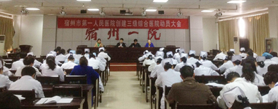 2015年3月26日下午,宿州市第一人民医院在门诊八楼多功能会议室隆重举行“宿州市第一人民医院创建三级综合医院再动员大会”。院领导孟令盘、孙建田、李秀君、支淑华等出席会议;医院各科室主任、副主任、护士长、副护士长,职能科室负责人,各党支部书记、工会组织等120余人参加会议。会议由院长孟令盘主持并作动员讲话。