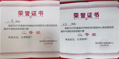 近日,2025年宿州市神经内科质控中心静脉溶栓谈话技能竞赛圆满落幕。在这场聚焦脑卒中救治核心能力的专业比拼中,我院神经医学中心江锋、周肖两位医师凭借扎实的专业功底与出色的沟通能力,从众多选手中脱颖而出,最终荣获“二等奖”的优异成绩,为医院赢得了荣誉。
