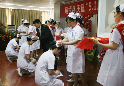 魏士忠院长(左三)、支淑华主任(右二)、夏中华护士长(左二)为新护士授帽