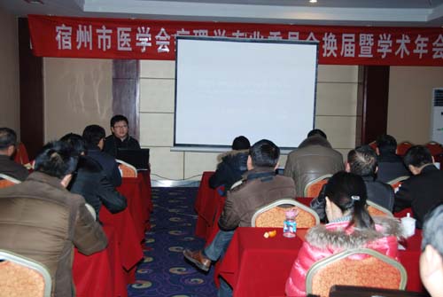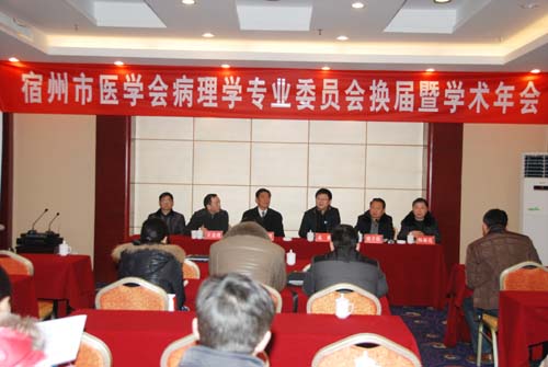 宿州市医学会病理学专业委员会换届选举暨学术年会于2013年1月20日在宿州市汇源大酒店召开。本次会议由宿州市医学会主办,宿州市第一人民医院协办。会议的主题是:繁荣交流形式,促进专业发展。应邀出席会议的领导和嘉宾有宿州市卫生局副局长宋天祥,市医学会主任张立仿,安徽省医学会病理学分会主任委员、安徽医科大学教授孟刚,市各大医院病理科负责人,亳州市、淮北市医学会病理学会负责人等, 宿州市各医院病理科医技专业人员三十余人参加了会议。