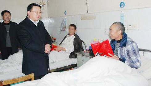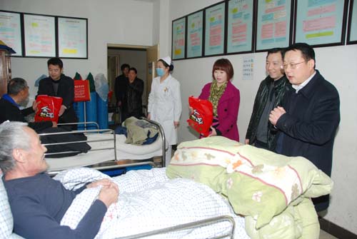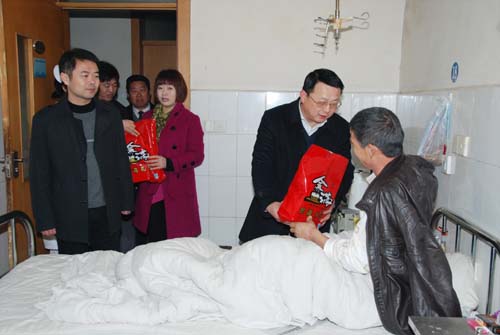2013年2月9日是中国传统的大年三十,这一天,家家户户都在忙着置办年夜饭,准备过年。下午6时,宿州市第一人民医院领导带着节日礼品来到住院病房看望慰问由于身体原因,不能回家与亲人共渡春节的住院患者。