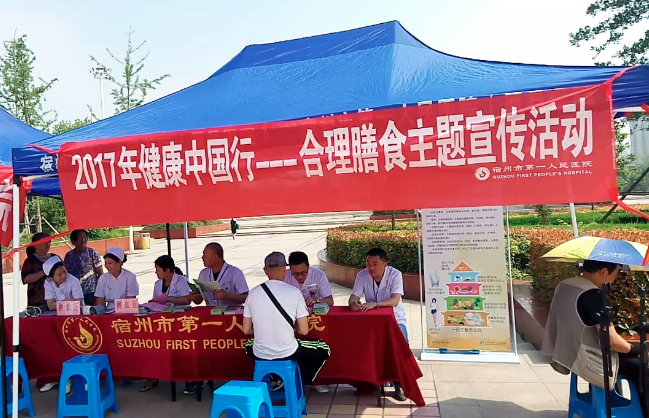 为积极配合宿州市卫计委开展2017年“健康中国行---合理膳食”宿州站主题系列宣传活动,大力传播健康知识,满足广大群众日益增长的健康需求,引导群众树立健康的“合理膳食”观念,推动“健康中国”建设,6月19日上午我院参加了宿州市卫计委在银河广场举办的健康中国行---合理膳食主题宣传活动。活动现场前来咨询的群众络绎不绝,医护人员热情接待每一位前来咨询的群众,给他们测量血压、询问身体状况、讲解合理膳食常识,受到群众的一致好评。