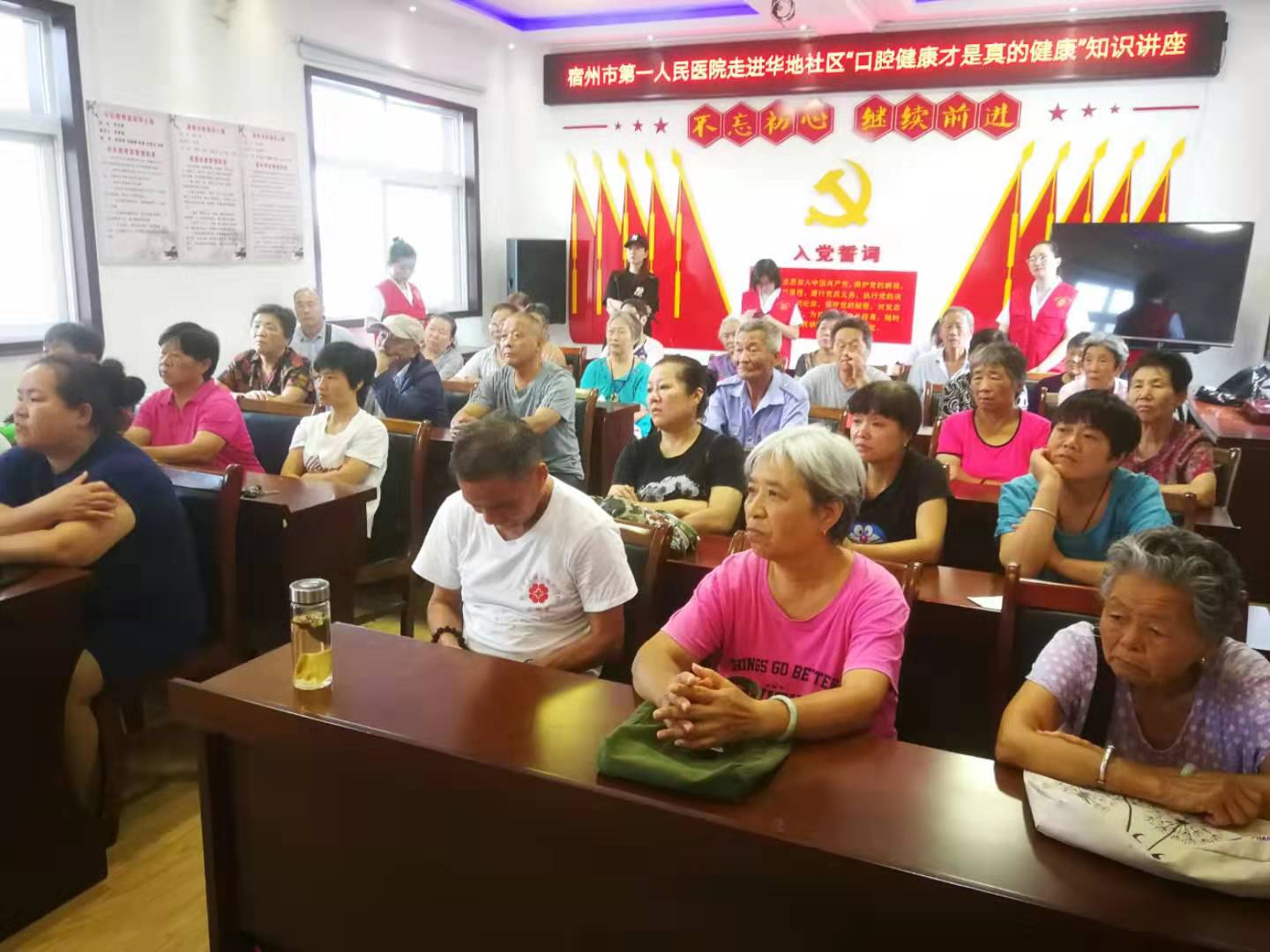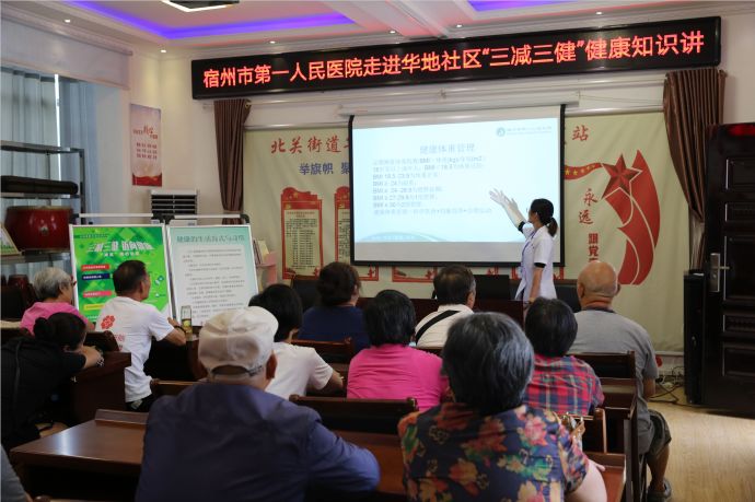 为贯彻落实《健康中国行动》《关于开展宿州市2019年全民健康生活方式月宣传活动的通知》有关要求,为进一步传播和普及健康生活技能,营造良好社会氛围,提升群众口腔健康素养水平,促进口腔健康行为的形成。2019年9月11日,公共卫生科联合膳食科及口腔科一行6人走进华地社区为社区居民举办了两场知识讲座:“三减三健”“口腔健康,才是真健康”。辖区约50名社区老年人参加了此次讲座。