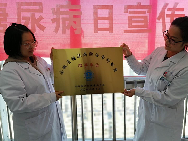 在安徽省糖尿病协会的统一部署下,利用“安徽省糖尿病防治专科联盟”项目,11月14日,我院内分泌科王晓飞主任、李会敏护士长组织医务人员深入社区举办糖尿病知识宣传义诊活动。义诊现场,广大市民积极前来咨询并接受检查,护士为他们测量血压及血糖,并耐心地答疑解惑。积极向大家宣传糖尿病知识,告诉他们如何防治糖尿病,糖尿病综合治疗中的五项重要措施,提升大家对糖尿病的认识水平,从而改善他们的工作与生活质量,减少糖尿病给自己及家人带来的危害。活动现场,李会敏护士长还为大家生动形象地讲解了糖尿病饮食注意事项,向大家展示了“安徽省糖尿病防治专科联盟”的授牌,并为患者免费发放纪念礼品。